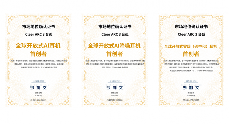 Cleer ARC 3 音弧的技術(shù)創(chuàng)新與環(huán)保理念也通過了國際權(quán)威機(jī)構(gòu)沙利文的認(rèn)證,獲得了“全球開放式AI降噪耳機(jī)首創(chuàng)者”、“全球開放式零碳(碳中和)耳機(jī)首創(chuàng)者”、“全球開放式AI耳機(jī)首創(chuàng)者”等多項(xiàng)榮譽(yù)證書。這些認(rèn)證不僅是對(duì)Cleer產(chǎn)品創(chuàng)新的高度肯定,也進(jìn)一步奠定了Cleer在國際聲學(xué)領(lǐng)域的領(lǐng)先地位。